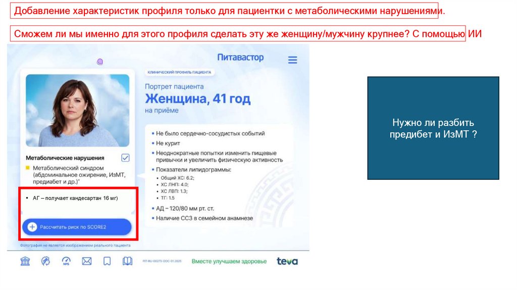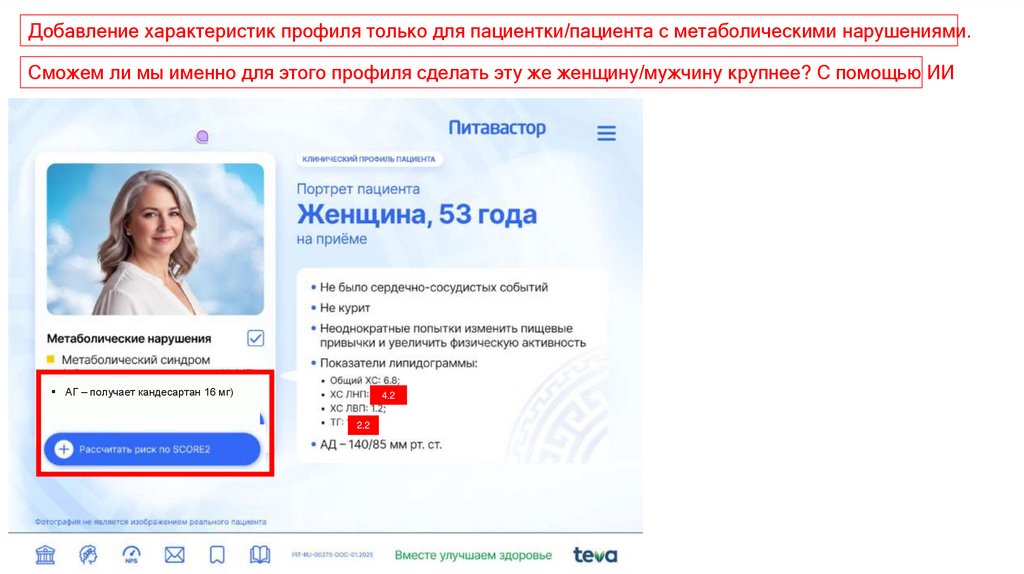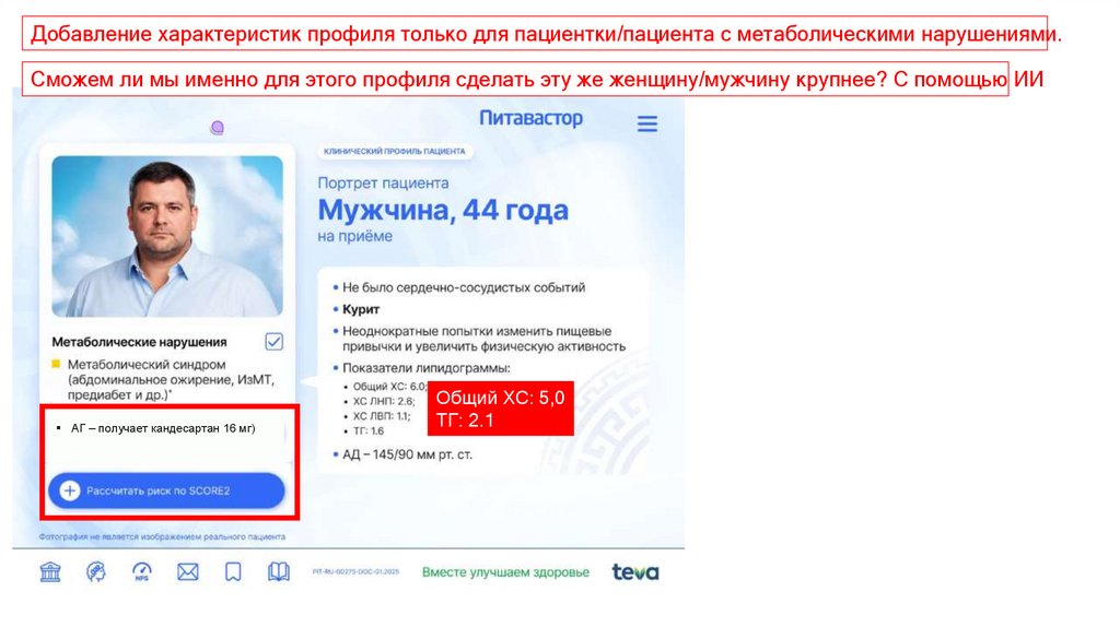 Добавление характеристик профиля только для пациентки с метаболическими нарушениями.Сможем ли мы именно для этого профиля сделать эту же женщину/мужчину крупнее? С помощью ИИ