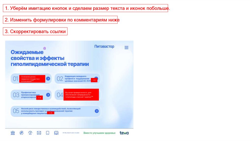 1. Уберём имитацию кнопок и сделаем размер текста и иконок побольше.2. Изменить формулировки по комментариям ниже