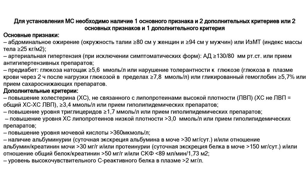 — абдоминальное ожирение (окружность талии ≥80 см у женщин и ≥94 см у мужчин) или ИзМТ (индекс массы