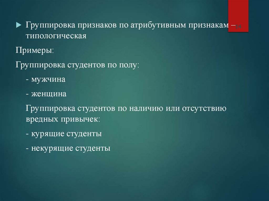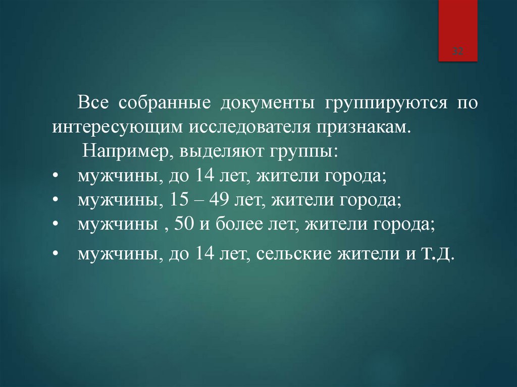 • мужчины, до 14 лет, сельские жители и т.д.