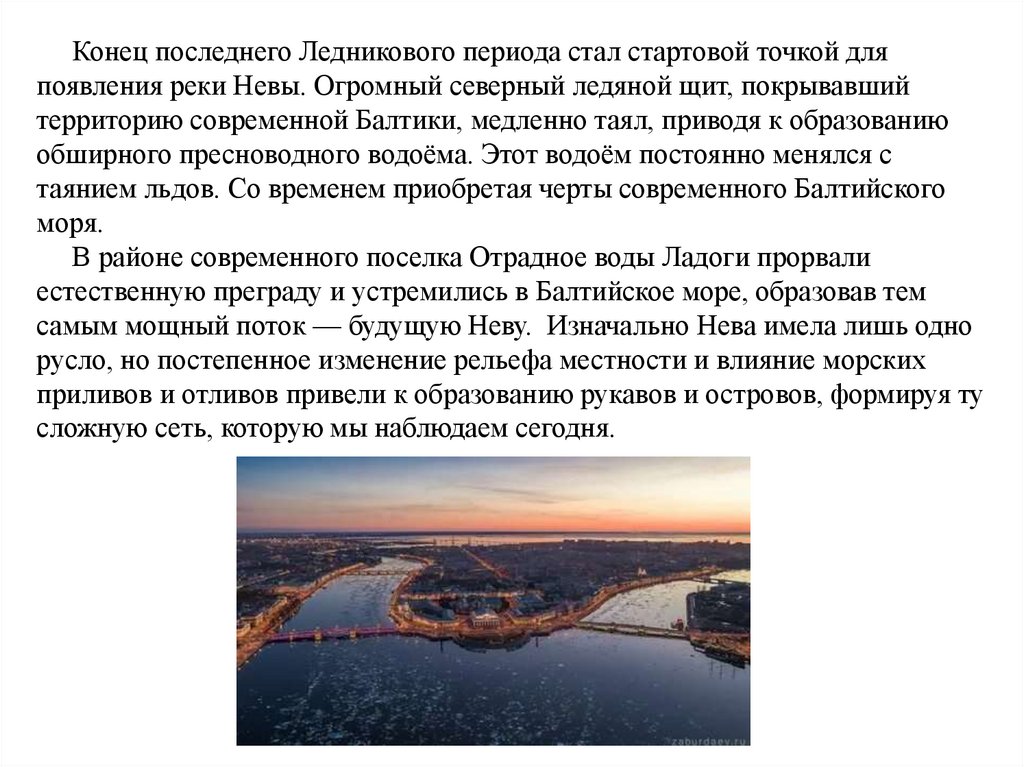 Конец последнего Ледникового периода стал стартовой точкой дляпоявления реки Невы. Огромный северный ледяной щит, покрывавший
