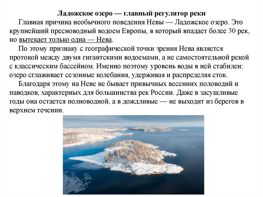 Ладожское озеро — главный регулятор рекиГлавная причина необычного поведения Невы — Ладожское озеро. Это