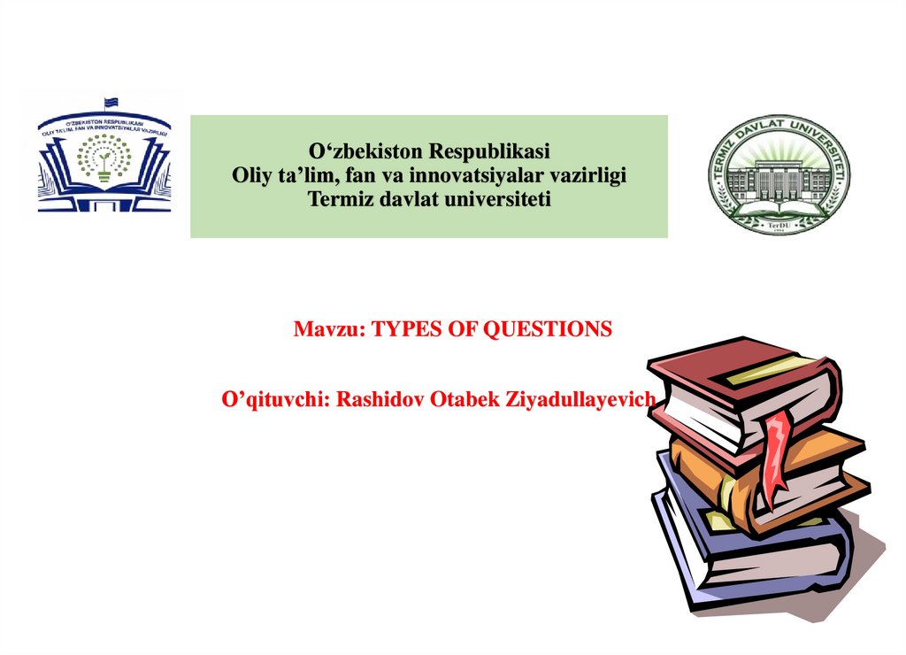 Mavzu: TYPES OF QUESTIONSO’qituvchi: Rashidov Otabek Ziyadullayevich
