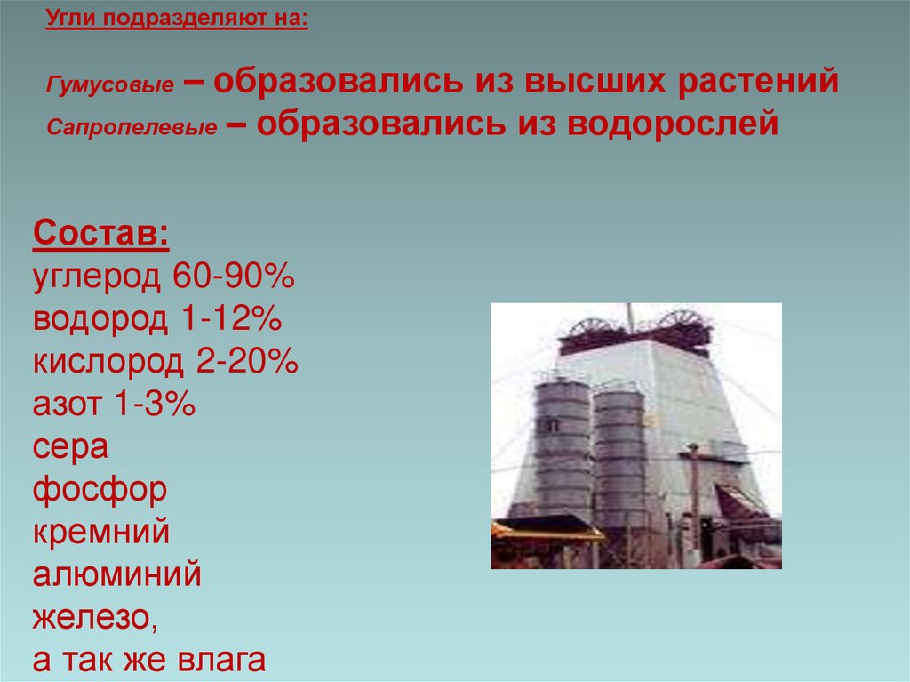 Угли подразделяют на:Гумусовые – образовались из высших растений