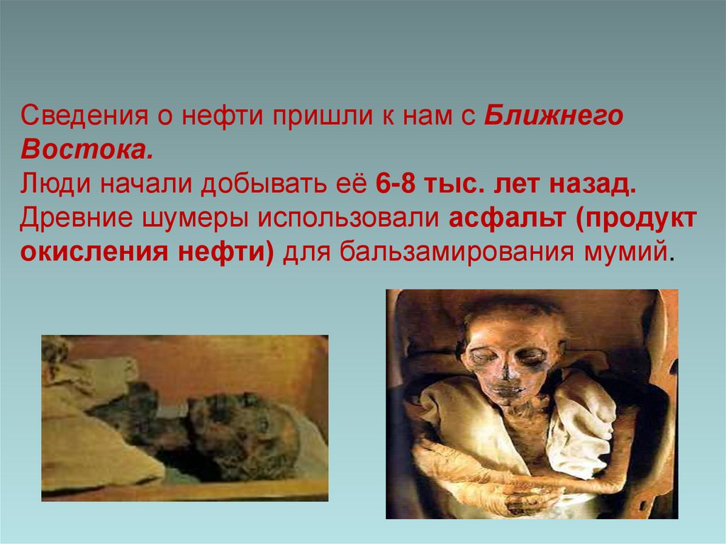 окисления нефти) для бальзамирования мумий.