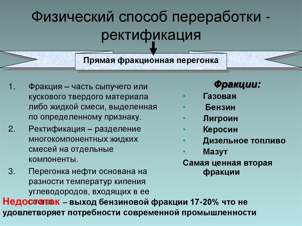 Физический способ переработки ректификацияПрямая фракционная перегонка