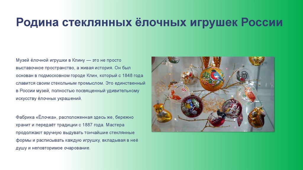 Родина стеклянных ёлочных игрушек РоссииМузей ёлочной игрушки в Клину — это не просто