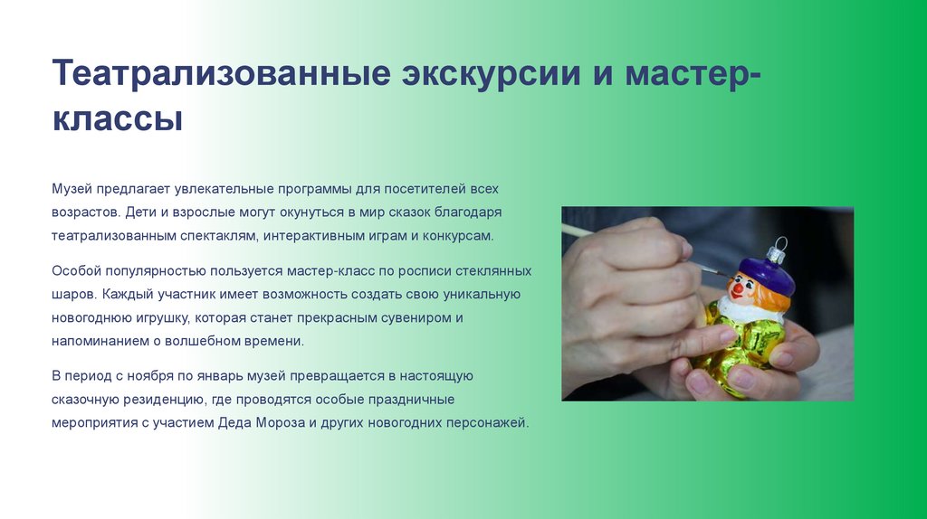 Театрализованные экскурсии и мастерклассыМузей предлагает увлекательные программы для посетителей всех