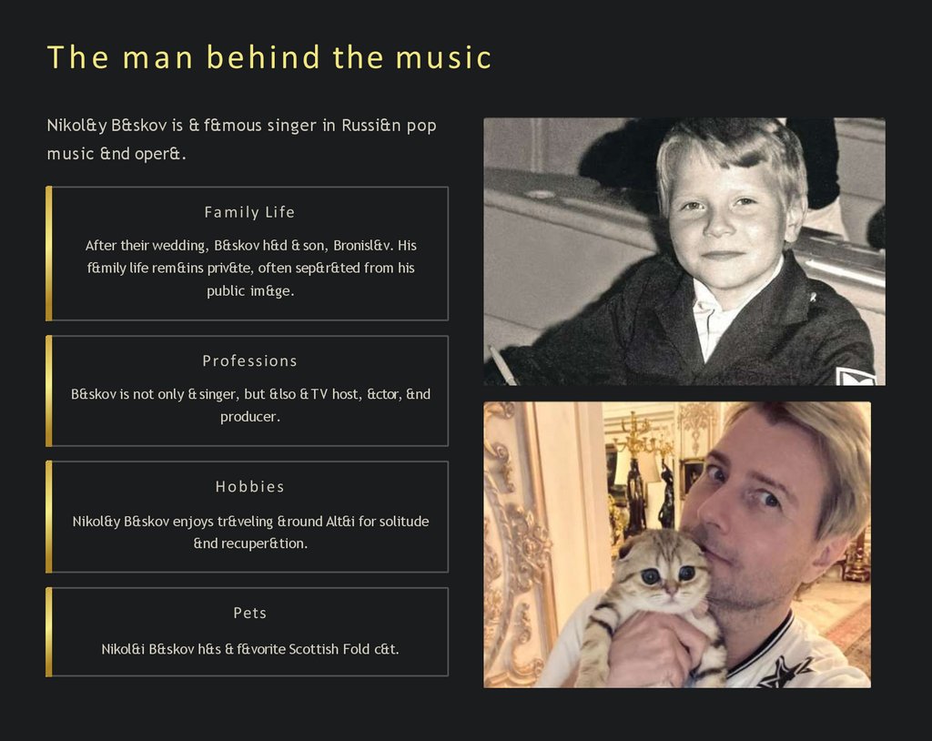 T h e m a n behind the m u sicNikol&y B&skov is & f&mous singer in Russi&n pop