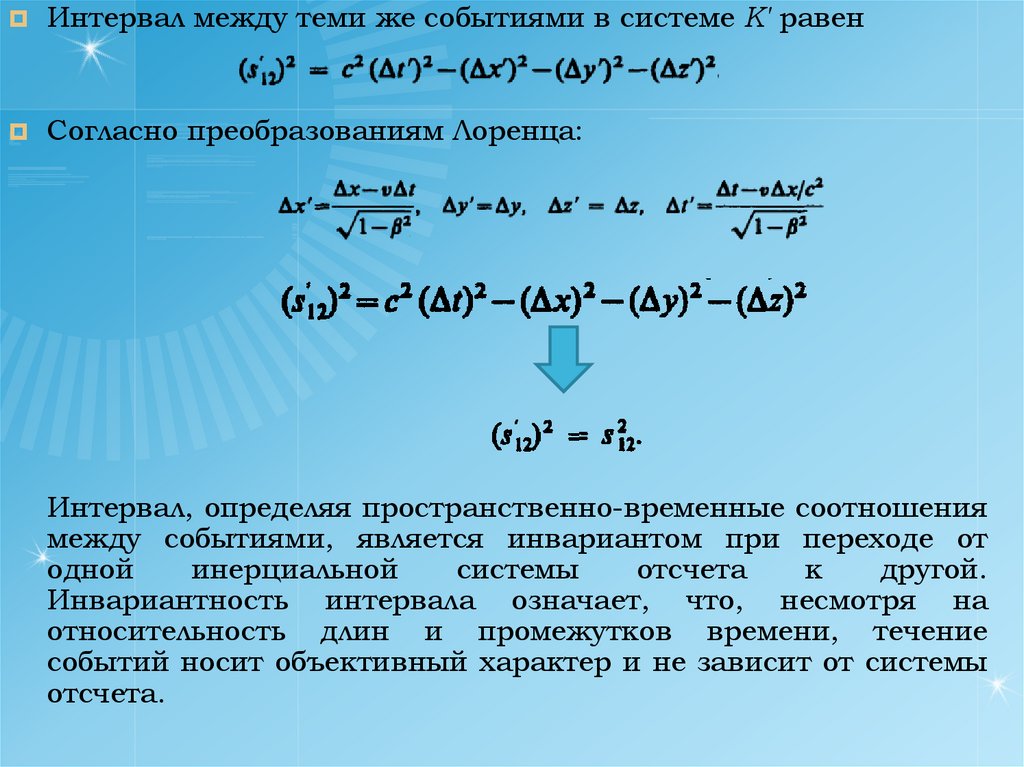 Интервал между теми же событиями в системе К' равенСогласно преобразованиям Лоренца:
