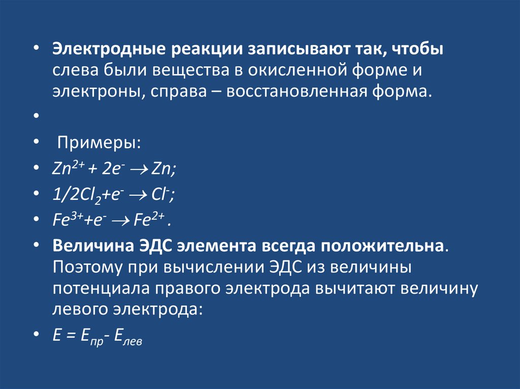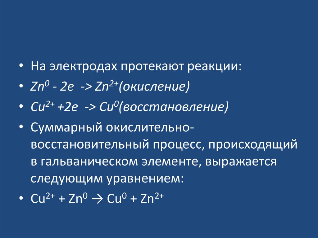 • На электродах протекают реакции:• Zn0 - 2e -> Zn2+(окисление)
