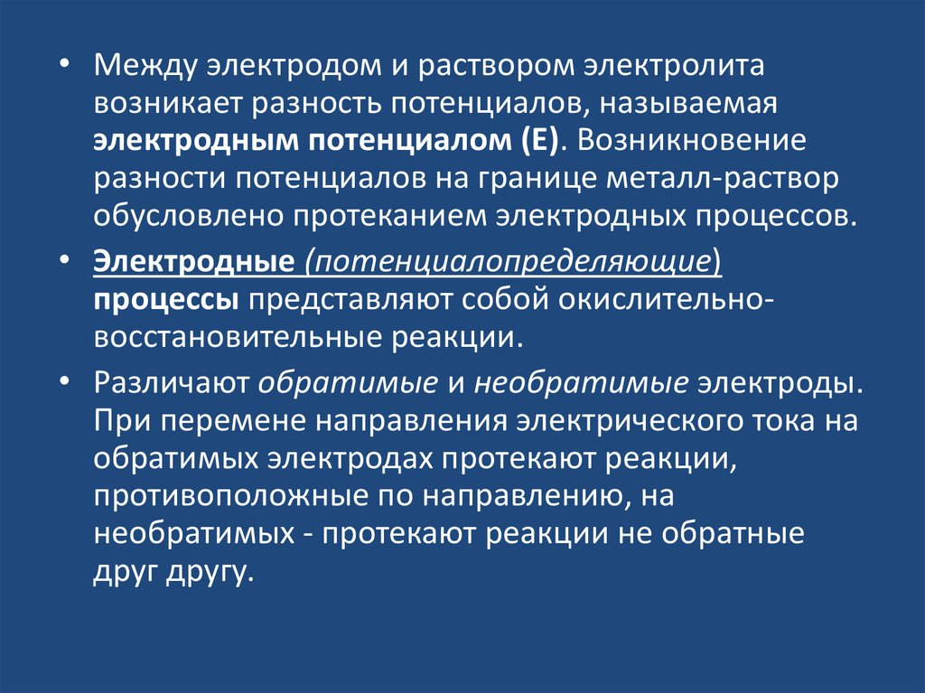 • Различают обратимые и необратимые электроды.