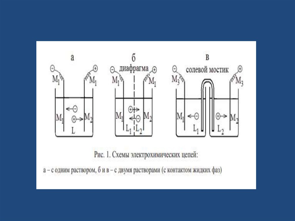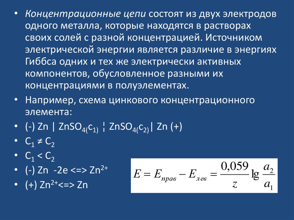 • Концентрационные цепи состоят из двух электродоводного металла, которые находятся в растворах