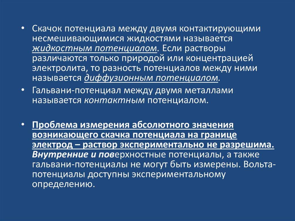 • Скачок потенциала между двумя контактирующиминесмешивающимися жидкостями называется