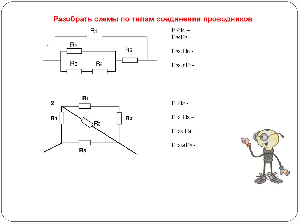 Разобрать схемы по типам соединения проводниковR3R4 –