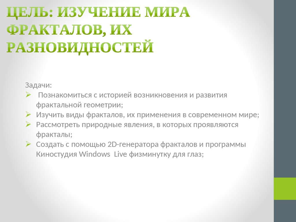 Изучить виды фракталов, их применения в современном мире;