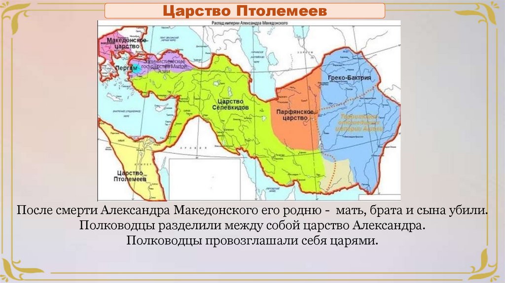 Царство ПтолемеевПосле смерти Александра Македонского его родню - мать, брата и сына убили.