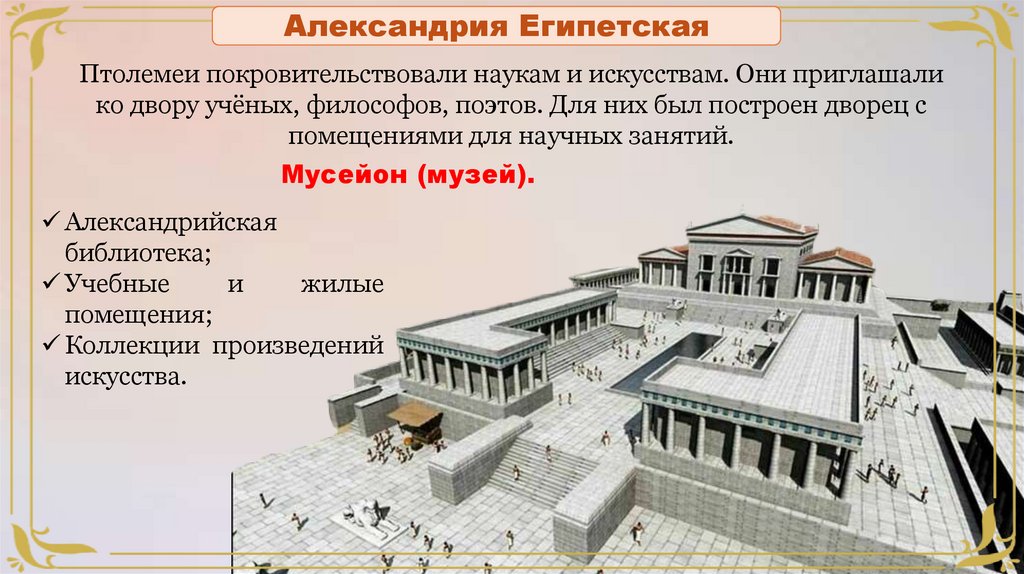 Александрия ЕгипетскаяПтолемеи покровительствовали наукам и искусствам. Они приглашали