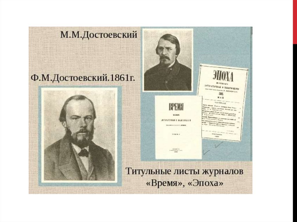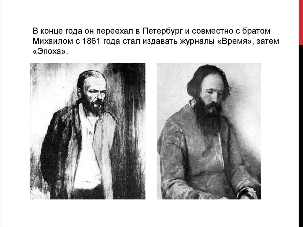 В конце года он переехал в Петербург и совместно с братомМихаилом с 1861 года стал издавать журналы «Время», затем