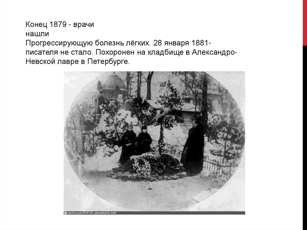 Прогрессирующую болезнь лёгких. 28 января 1881писателя не стало. Похоронен на кладбище в АлександроНевской лавре в Петербурге.