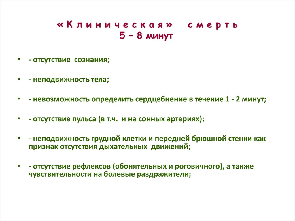• - невозможность определить сердцебиение в течение 1 - 2 минут;