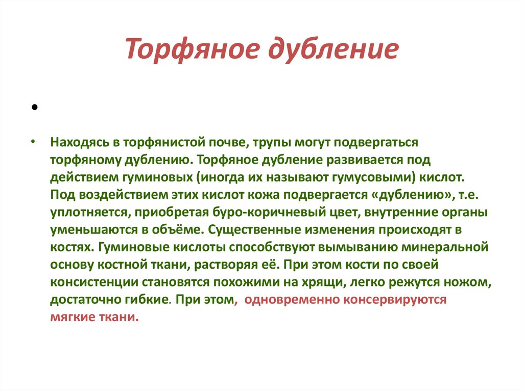 Торфяное дубление• Находясь в торфянистой почве, трупы могут подвергаться