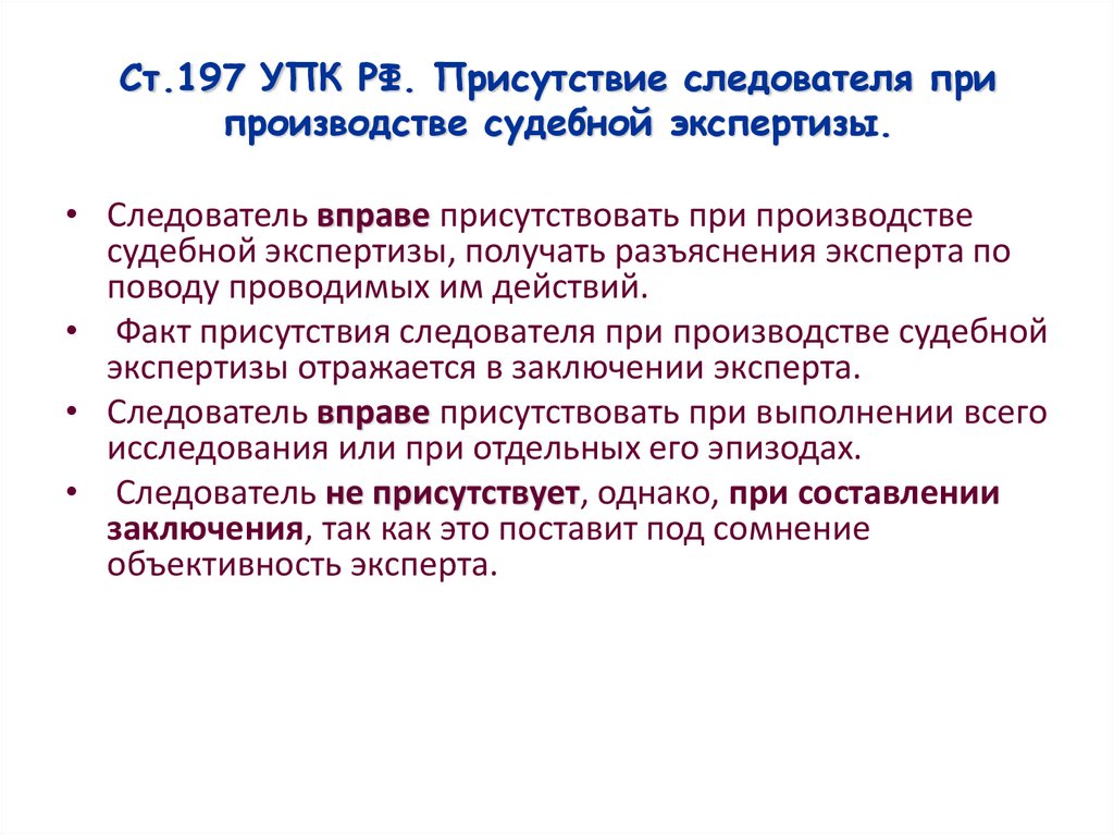 Ст.197 УПК РФ. Присутствие следователя припроизводстве судебной экспертизы.