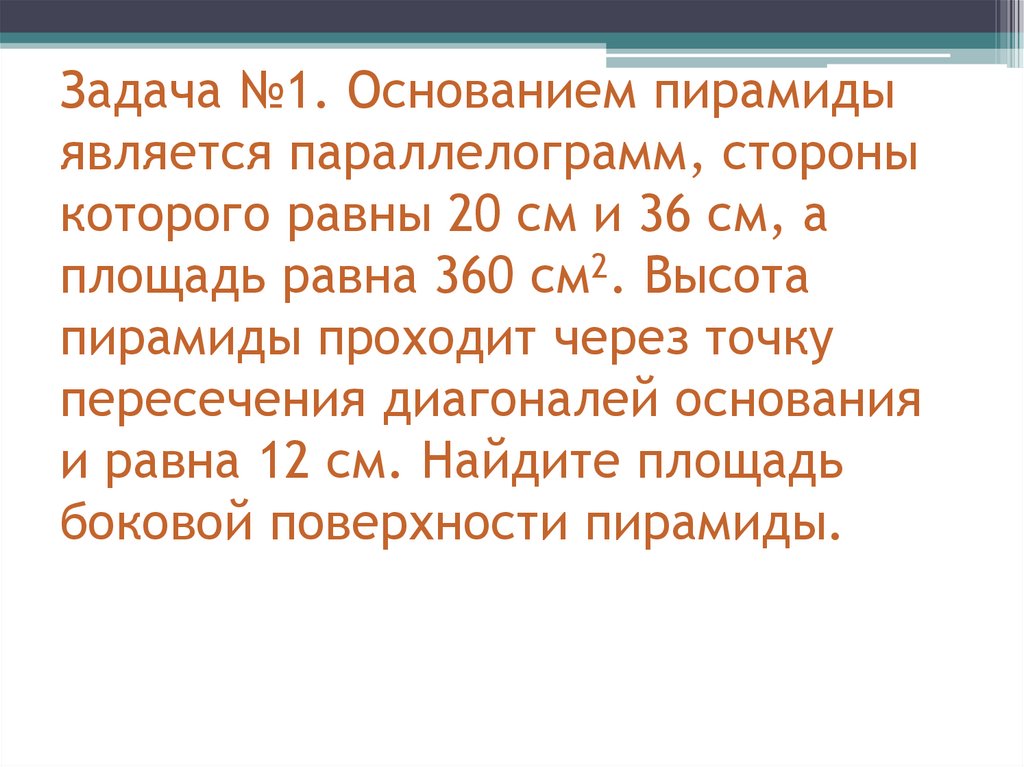 Задача №1. Основанием пирамидыявляется параллелограмм, стороны