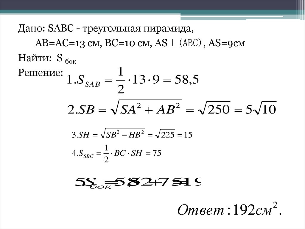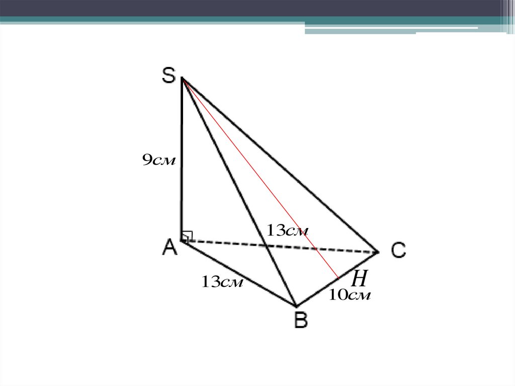 Дано: SABC - треугольная пирамида,AB=AC=13 см, BC=10 см, AS⊥(ABC), AS=9см