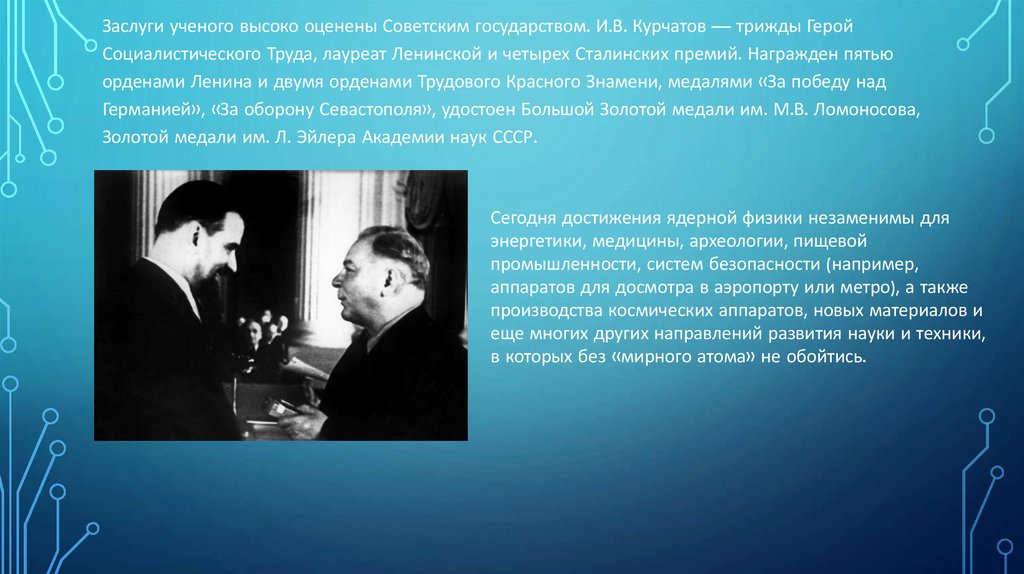 Заслуги ученого высоко оценены Советским государством. И.В. Курчатов — трижды ГеройСоциалистического Труда, лауреат Ленинской и четырех Сталинских премий. Награжден пятью