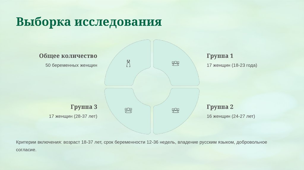 Критерии включения: возраст 18-37 лет, срок беременности 12-36 недель, владение русским языком, добровольное