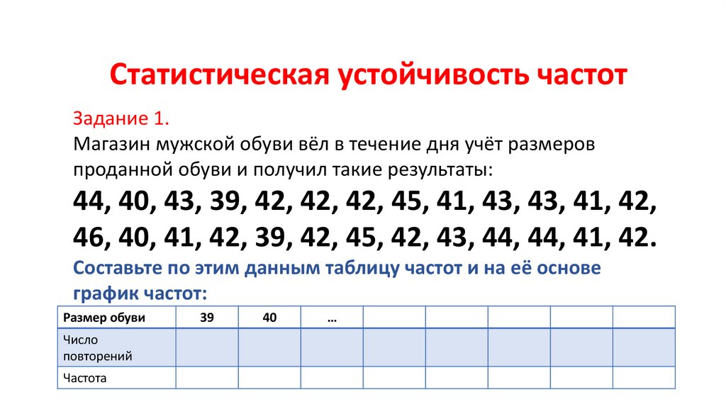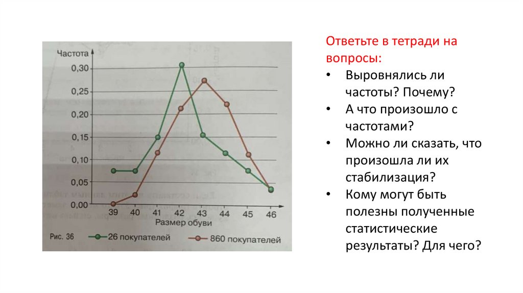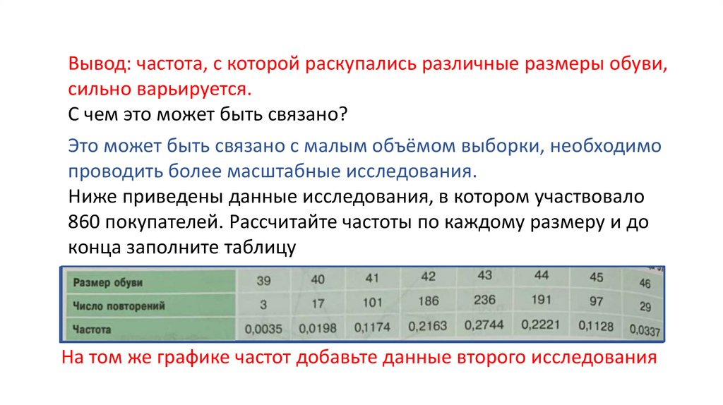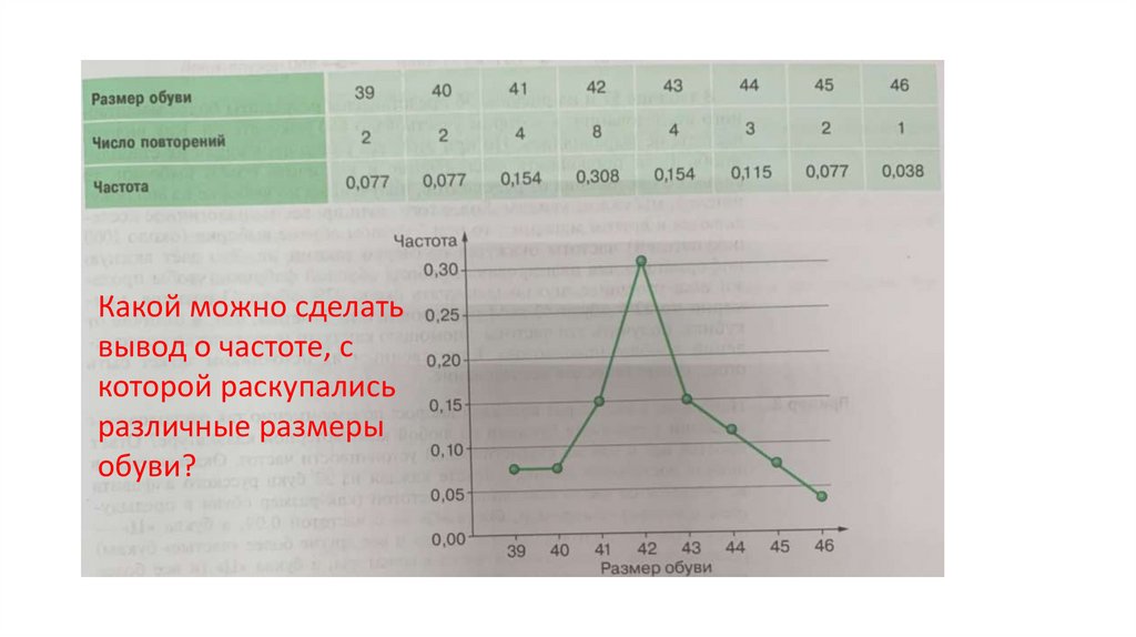 Вывод: частота, с которой раскупались различные размеры обуви,сильно варьируется.