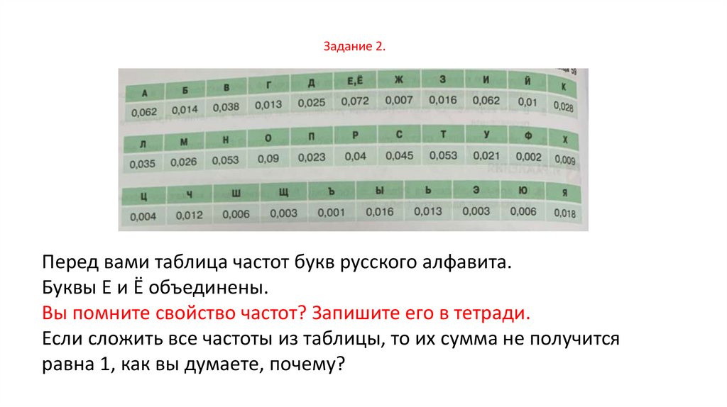Задание 2.Перед вами таблица частот букв русского алфавита.