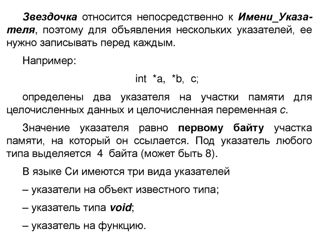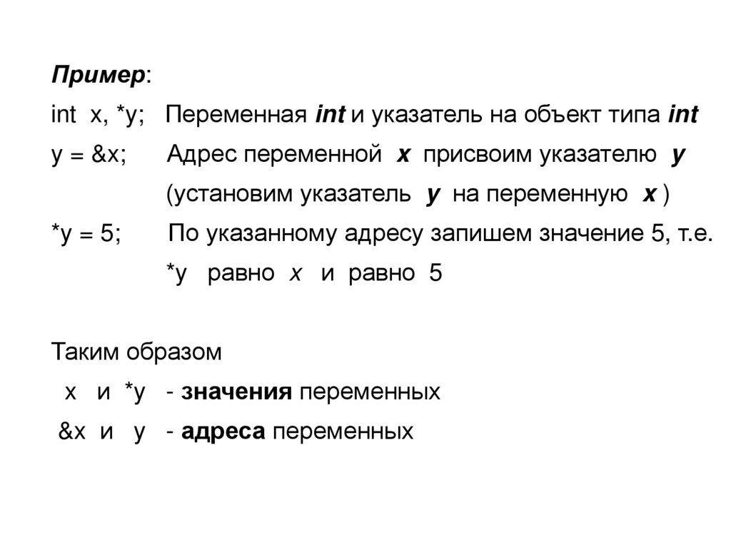 Пример:int x, *y; Переменная int и указатель на объект типа int