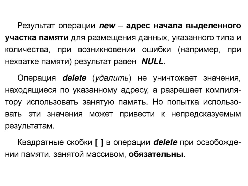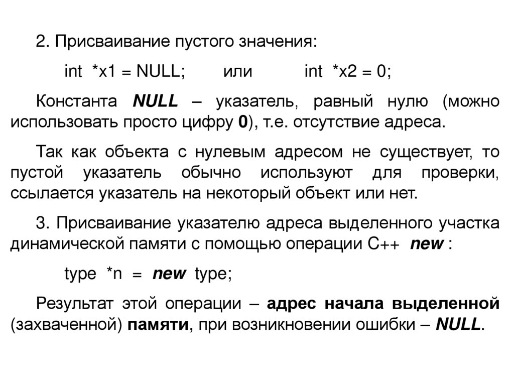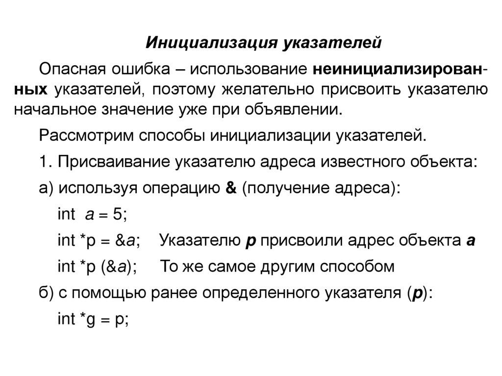 Инициализация указателейОпасная ошибка – использование неинициализированных указателей, поэтому желательно присвоить указателю