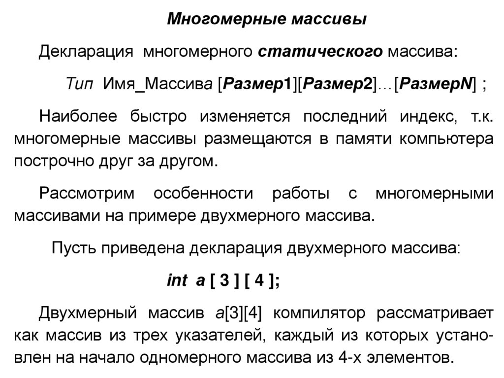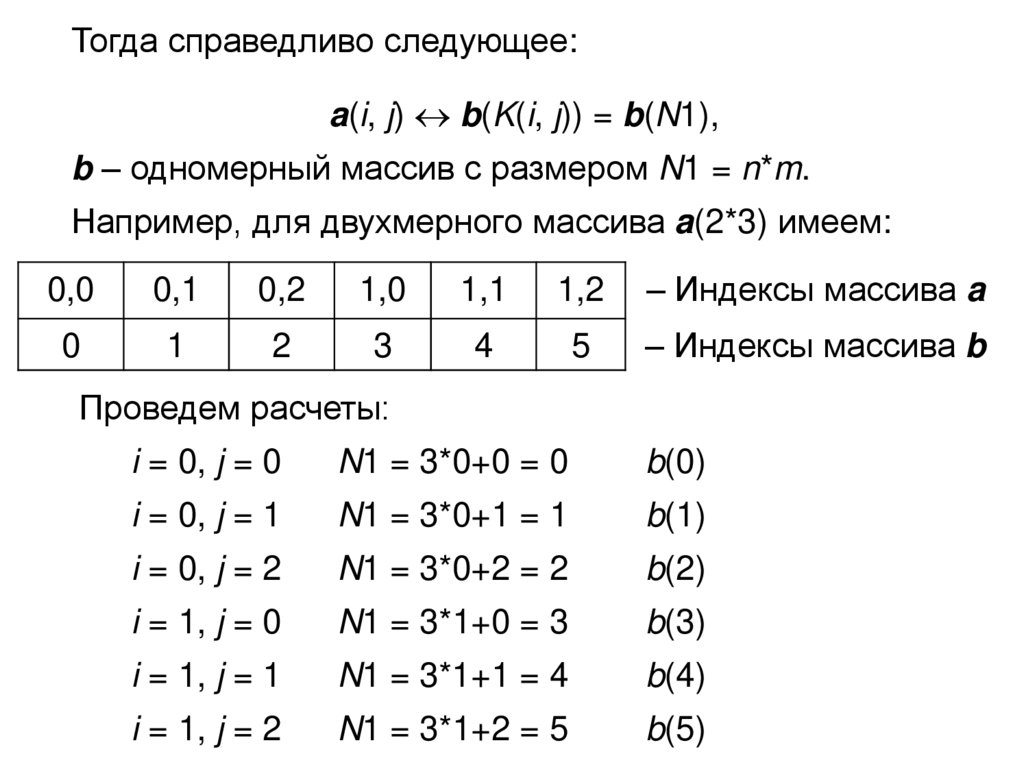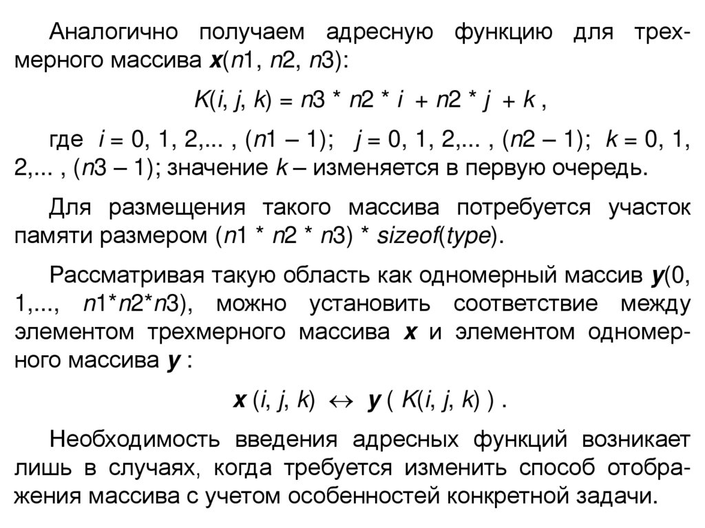 Аналогично получаем адресную функцию для трехмерного массива x(n1, n2, n3):K(i, j, k) = n3 * n2 * i + n2 * j + k ,