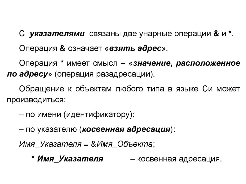С указателями связаны две унарные операции & и *.Операция & означает «взять адрес».
