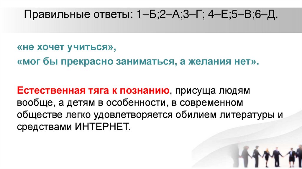 Правильные ответы: 1–Б;2–А;3–Г; 4–Е;5–В;6–Д.«не хочет учиться»,