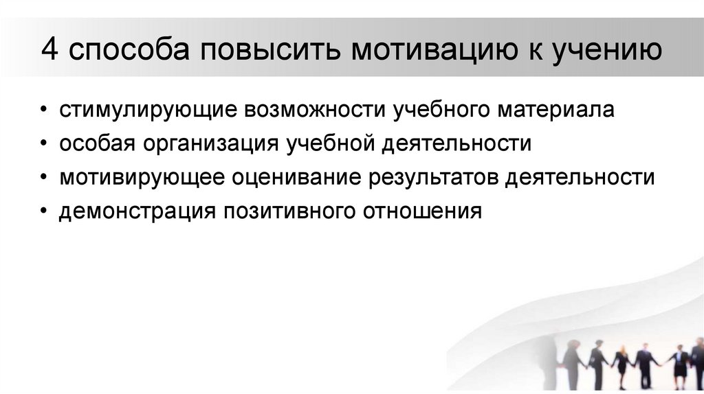 4 способа повысить мотивацию к учению• стимулирующие возможности учебного материала