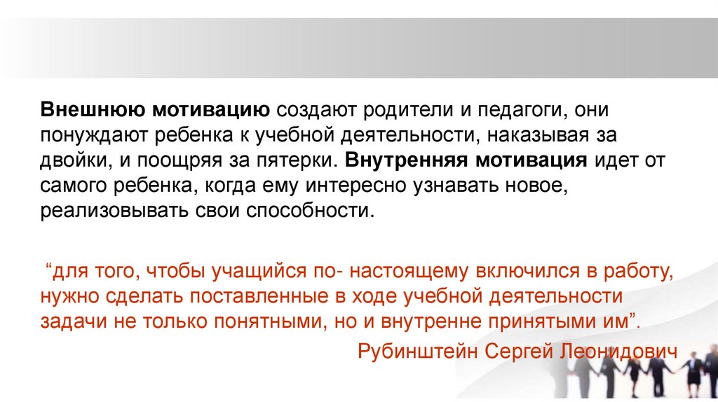 Внешнюю мотивацию создают родители и педагоги, онипонуждают ребенка к учебной деятельности, наказывая за