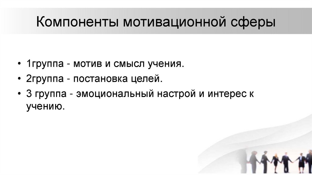 Компоненты мотивационной сферы• 1группа - мотив и смысл учения.
