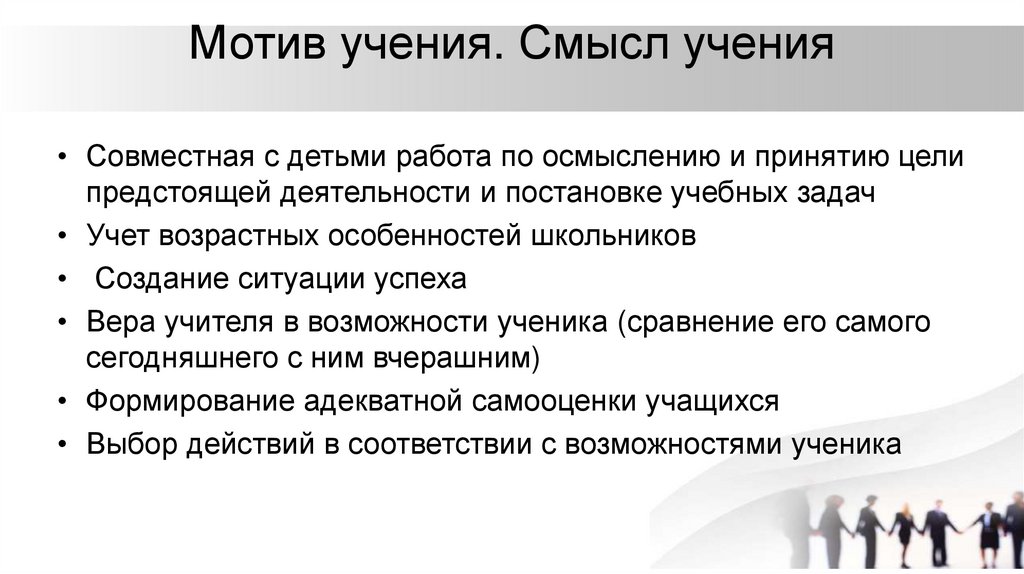 Мотив учения. Смысл учения• Совместная с детьми работа по осмыслению и принятию цели