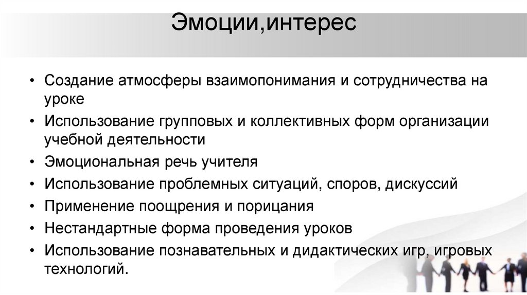 Эмоции,интерес• Создание атмосферы взаимопонимания и сотрудничества на