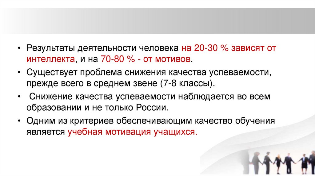 • Результаты деятельности человека на 20-30 % зависят отинтеллекта, и на 70-80 % - от мотивов.