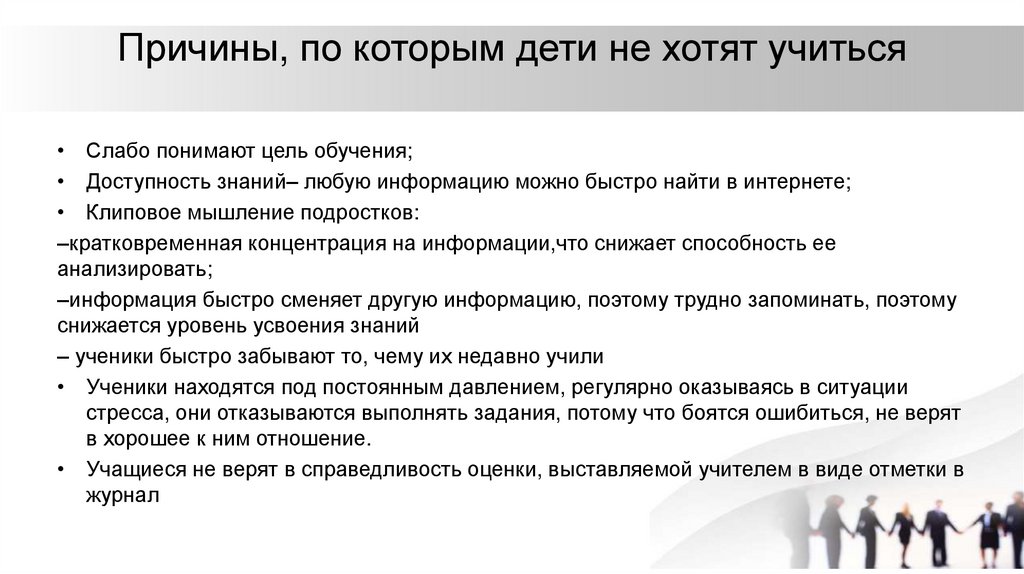 Причины, по которым дети не хотят учиться• Слабо понимают цель обучения;