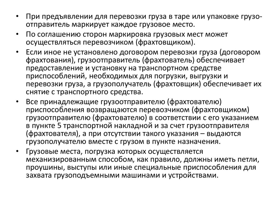 • При предъявлении для перевозки груза в таре или упаковке грузоотправитель маркирует каждое грузовое место.• По соглашению сторон маркировка грузовых мест может