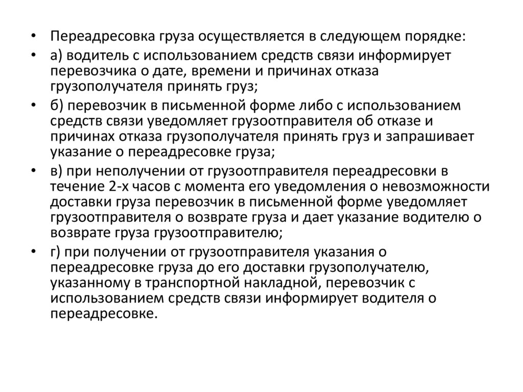 • Переадресовка груза осуществляется в следующем порядке:• а) водитель с использованием средств связи информирует