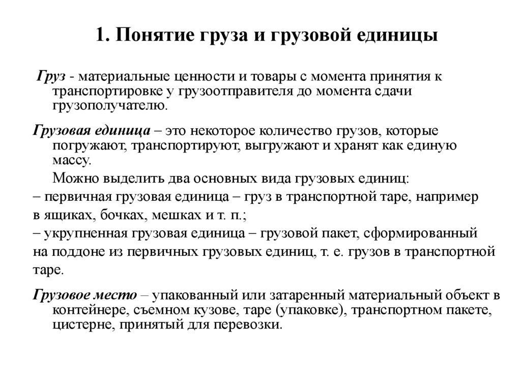 1. Понятие груза и грузовой единицыГруз - материальные ценности и товары с момента принятия к