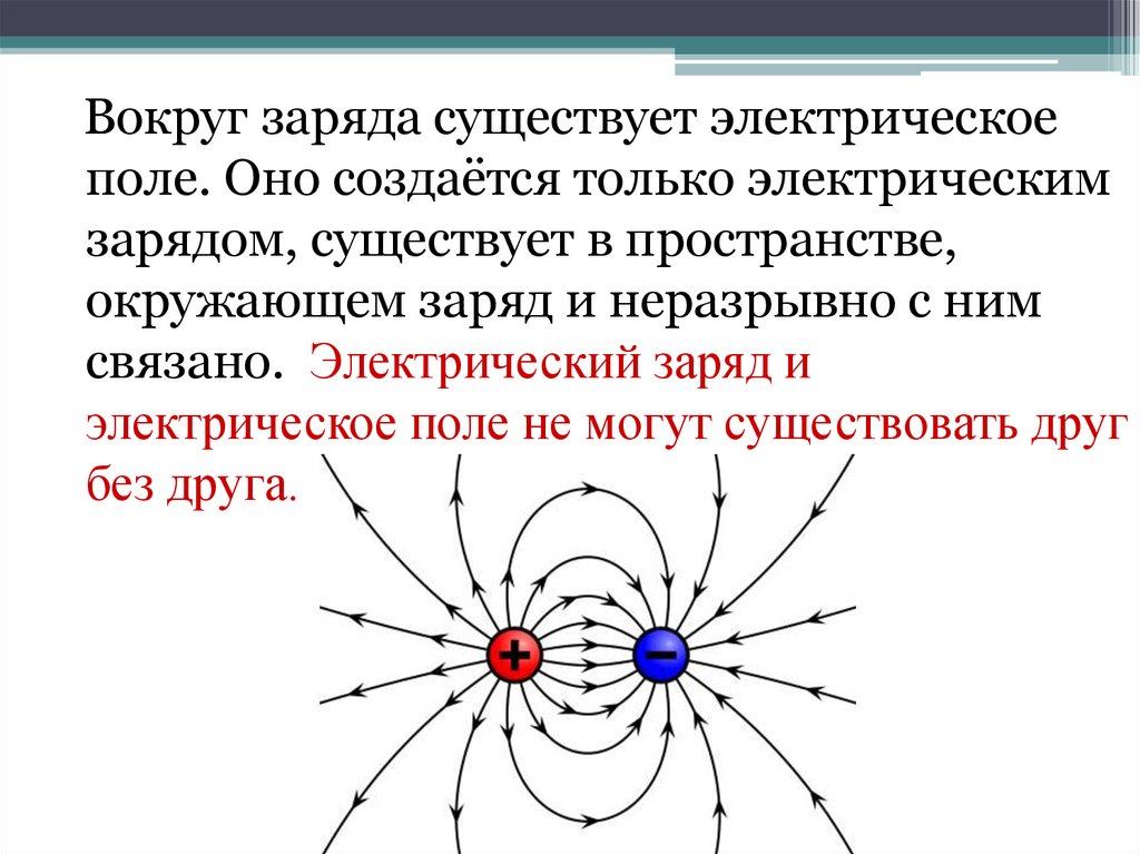 Вокруг заряда существует электрическоеполе. Оно создаётся только электрическим