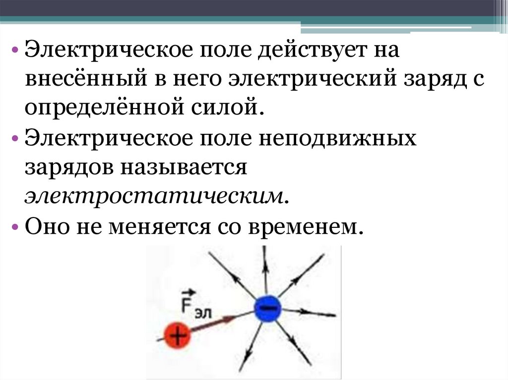 • Электрическое поле действует навнесённый в него электрический заряд с